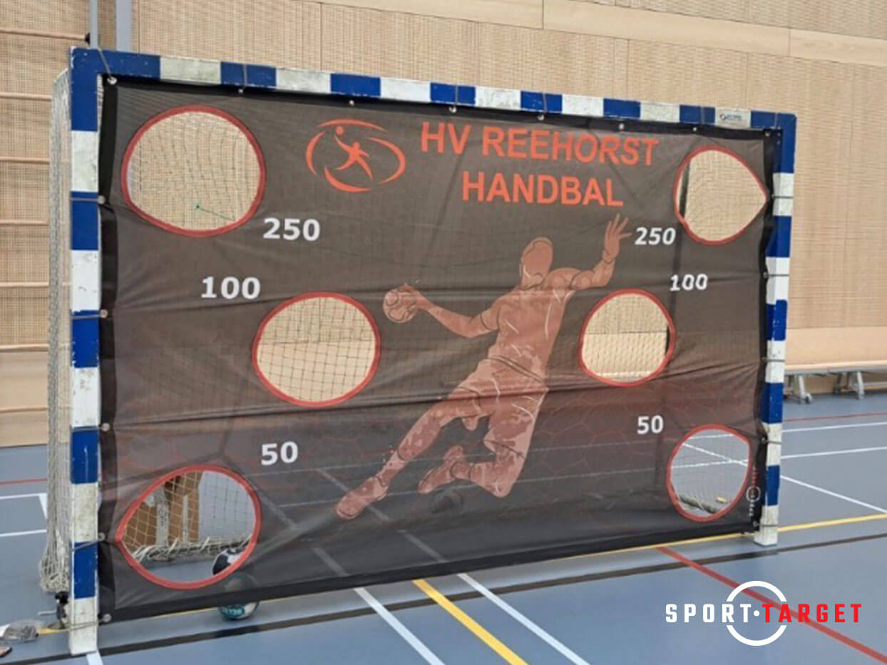 Voor Handbalvereniging Reehorst heeft Sporttarget met trots een volledig op maat ontworpen Handbaltarget geleverd. Dit unieke handbaldoek met schietgaten is ontworpen in de eigen stijl van de club, met herkenbare kleuren en het HV Reehorst-logo prominent in beeld.