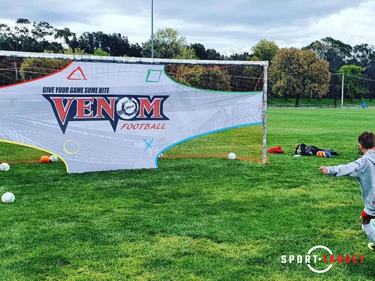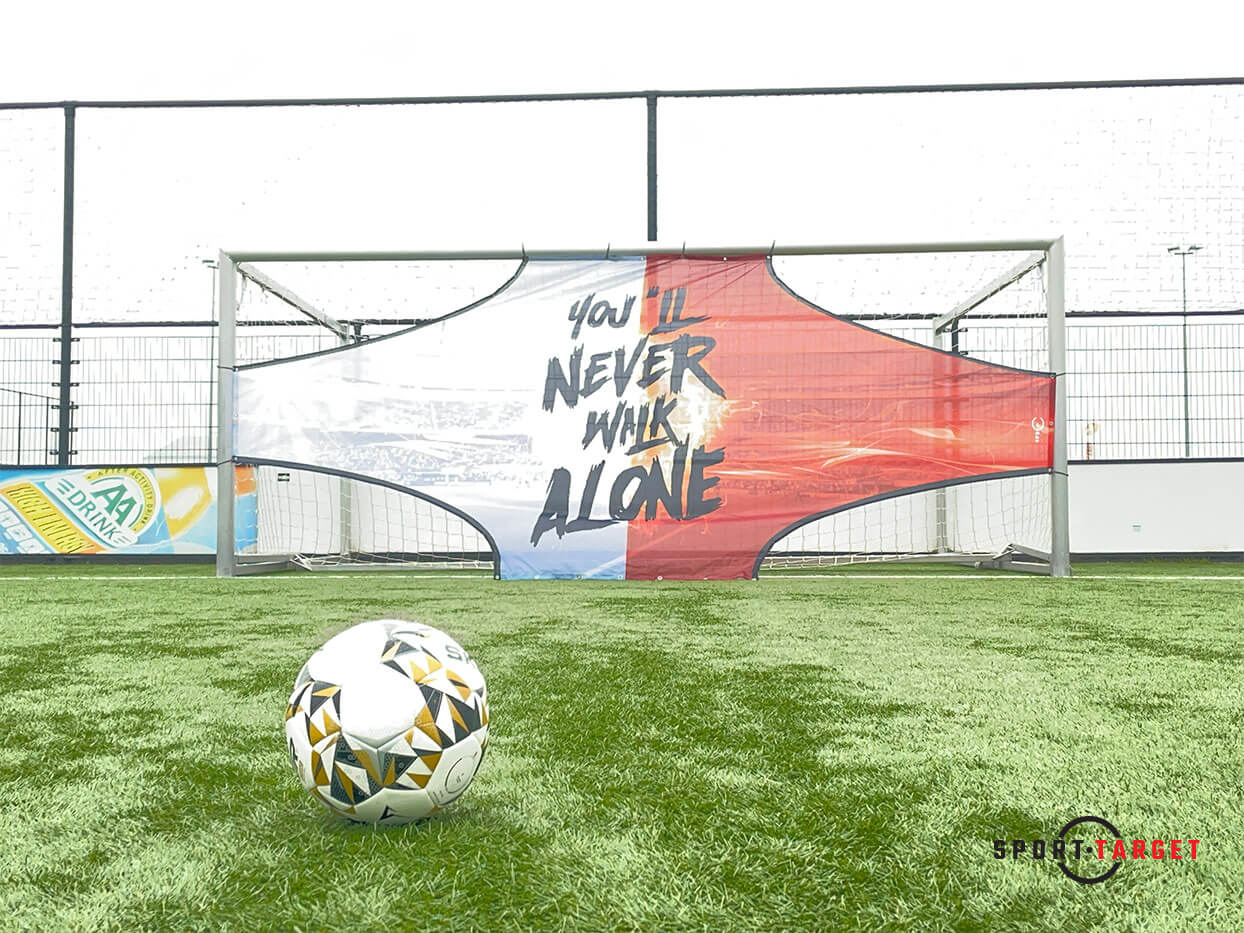 Onze Soccer Train Target custom design wordt standaard geleverd in twee maten. Voor een pupillendoel van 5m x 2m en een senioren doel van 7,32m x 2,44m.