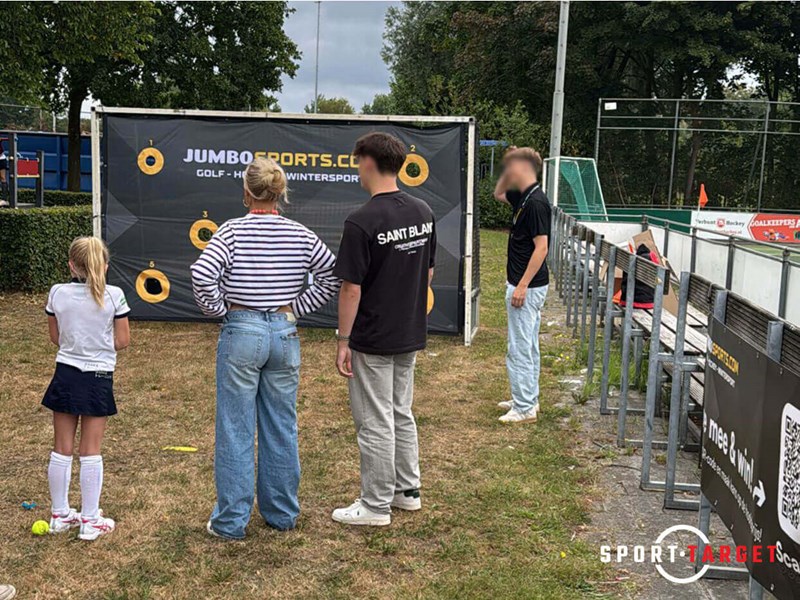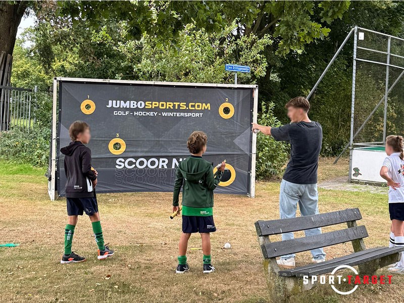 Voor een sportieve activatiecampagne heeft JumboSports gekozen voor een op maat gemaakt hockeytarget van Sporttarget. Dit opvallende hockey gatendoek daagt deelnemers uit om te scoren door de juiste gaten te raken — met als extra motivatie: kans maken op mooie prijzen!