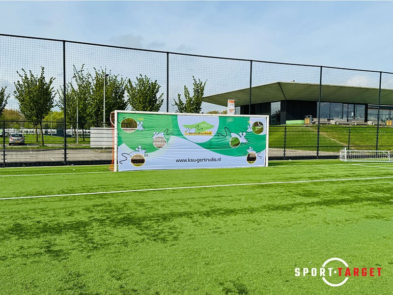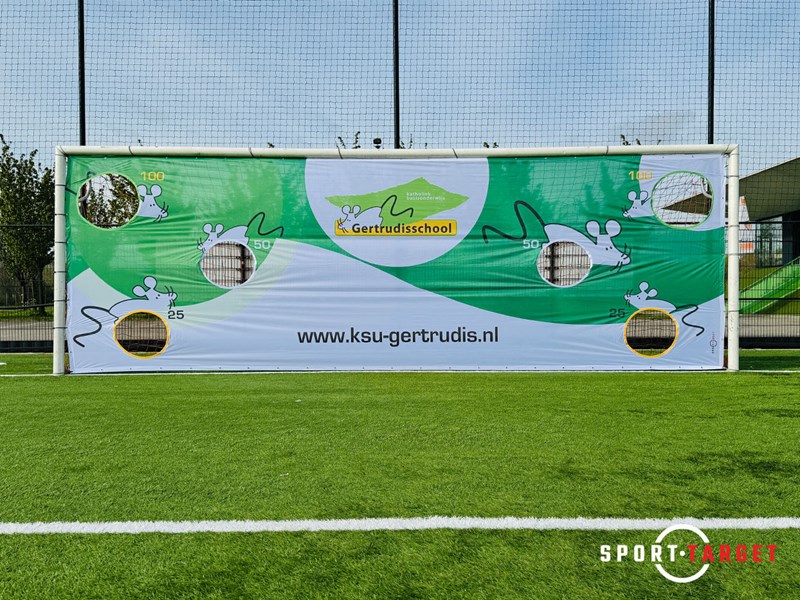 Wat een opwinding om samen te werken met de Gertrudisschool uit Utrecht en hun speelplezier naar een hoger niveau te tillen met onze op maat gemaakte voetbaltarget! Trots presenteren we deze target, met hun unieke logo, dat een leuk detail bevat - een muis die nieuwsgierig uitkijkt naar de doelgaten.