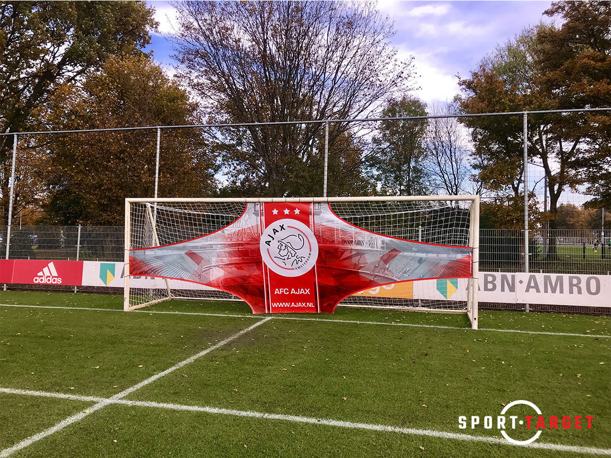 Onze Soccer Train Target custom design wordt standaard geleverd in twee maten. Voor een pupillendoel van 5m x 2m en een senioren doel van 7,32m x 2,44m.